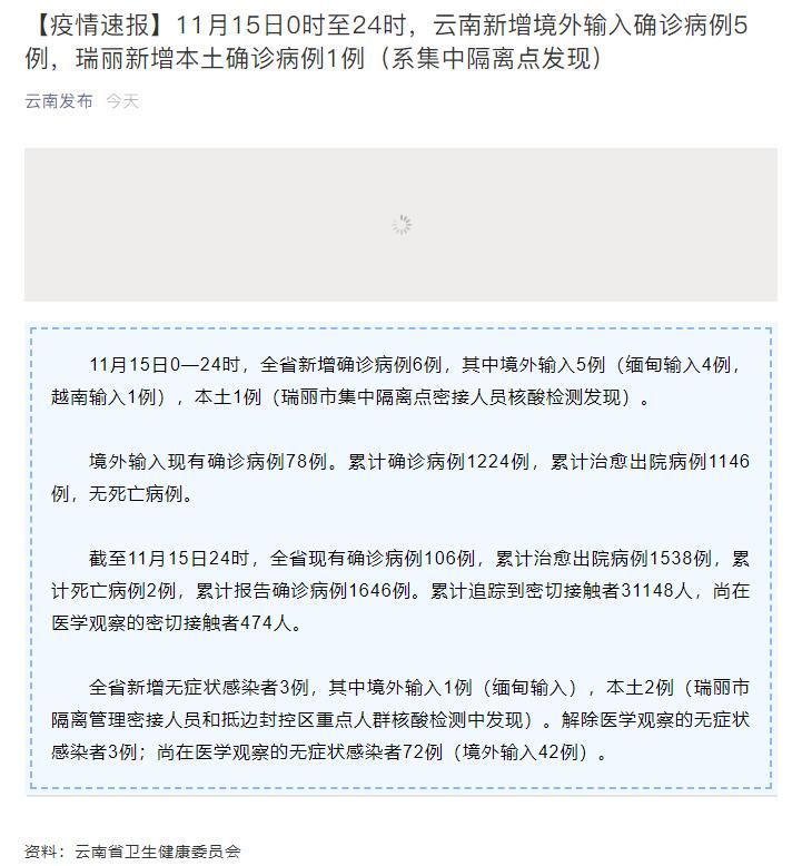 截至11月15日24时,云南省现有确诊病例106例,累计治愈出院病例1538例,累计死亡病例2例,累计报告确诊病例1646例。累计追踪到密切接触者31148人,尚在医学观察的密切接触者474人。