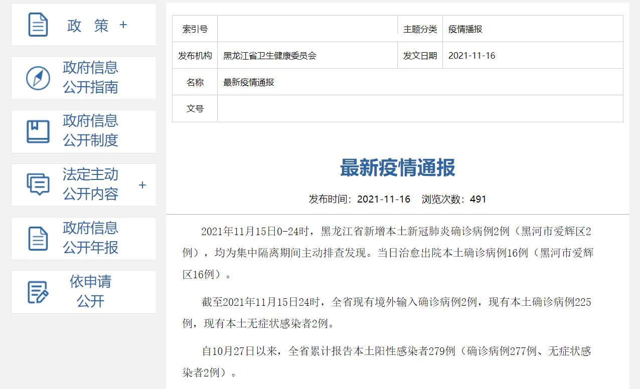 荔枝新闻讯 据黑龙江省卫健委消息,2021年11月15日0—24时,黑龙江省新增本土新冠肺炎确诊病例2例(黑河市爱辉区2例),均为集中隔离期间主动排查发现。当日治愈出院本土确诊病例16例(黑河市爱辉区16例)。