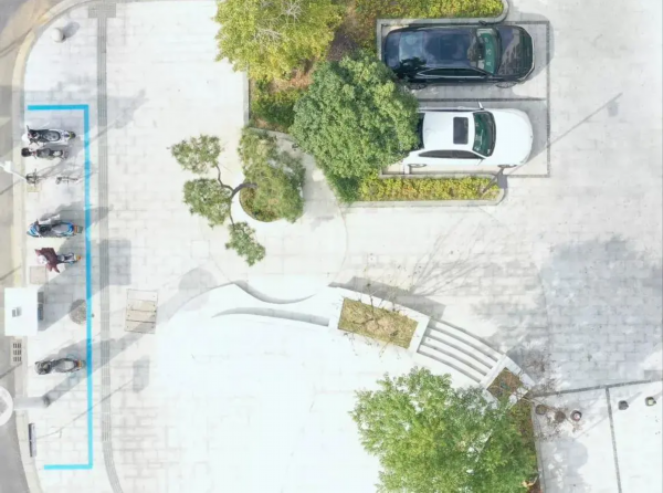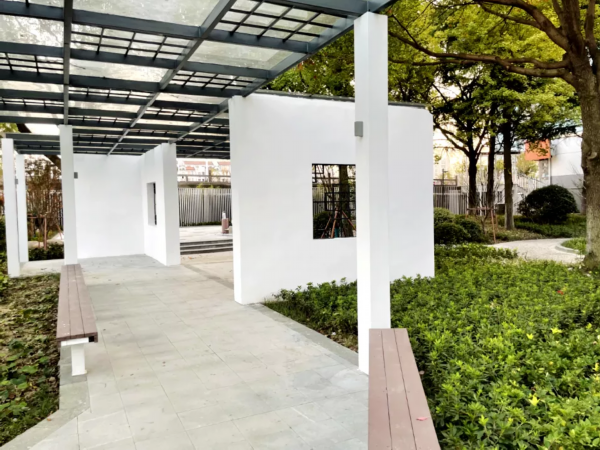 吴江实验小学太湖校区东门的口袋公园设有亭廊和坐凳,方便市民休憩,为接送孩子的家长提供等候空间。