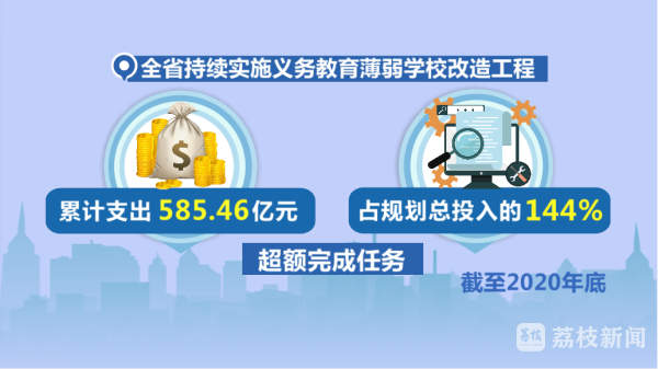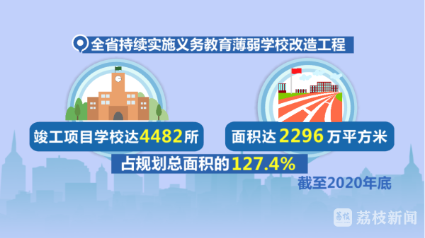 截至2020年底,全省持续实施义务教育薄弱学校改造工程,竣工项目学校达4482所、面积达2296万平方米,占规划总面积的127.4%,累计支出585.46亿元,占规划总投入的144%,超额完成任务。