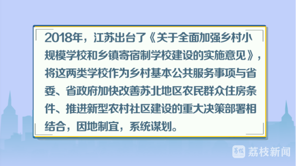 2018年,江苏出台了《关于全面加强乡村小规模学校和乡镇寄宿制学校建设的实施意见》,将这两类学校作为乡村基本公共服务事项与省委、省政府加快改善苏北地区农民群众住房条件、推进新型农村社区建设的重大决策部署相结合,因地制宜,系统谋划。