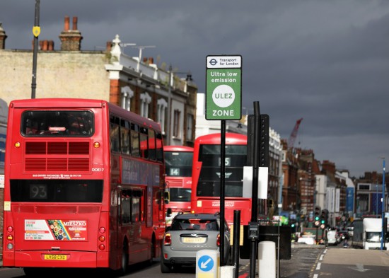 10月26日,在英国伦敦,车辆经过“超低排放区”指示牌。(新华社记者李颖摄)