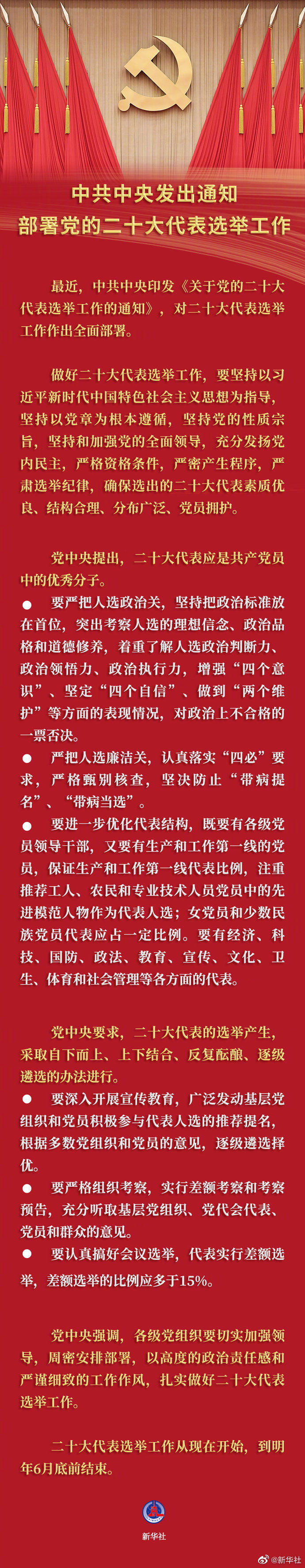 二十大代表选举工作从现在开始,到明年6月底前结束。