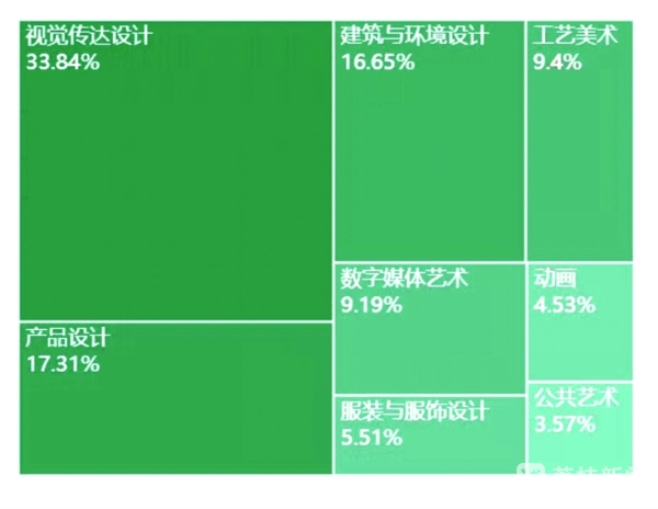 从作品类别看,覆盖8大专业:产品设计、动画、服装与服饰设计、工艺美术、公共艺术、建筑与环境设计、视觉传达设计、数字媒体艺术,其中视觉传达设计、产品设计和建筑与环境设计是主体,分别占比33.84%、17.31%和16.65%。