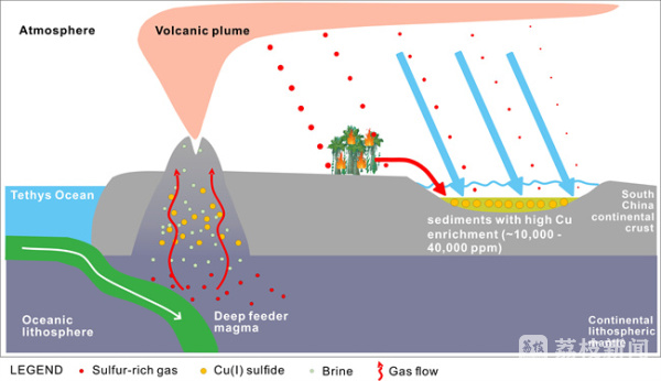 研究团队在云贵川地区的地质岩层考察时,发现铜和汞的含量异乎寻常的高,而这两种元素都和火山密切相关。经推算,华南周缘的酸性火山活动最少释放超过19亿吨的铜和几十亿吨的二氧化硫。
