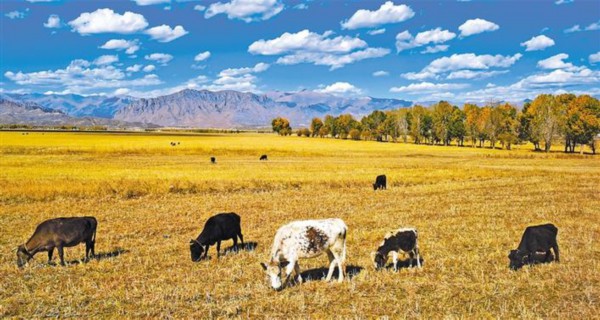 秋日的雪域高原魅力无限,蓝天、白云、黄叶、碧水、雪山及金色草原交相辉映,宛如一幅幅色彩缤纷的优美画卷。