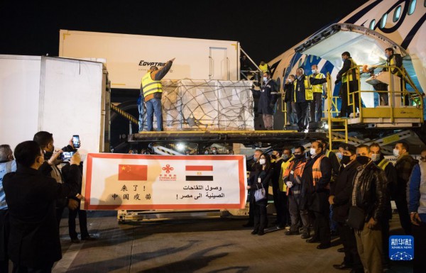 2月23日,在埃及开罗国际机场,工作人员运输疫苗。中国援助埃及的首批新冠疫苗当日凌晨运抵开罗,援助阿盟秘书处的新冠疫苗也同机抵达。新华社记者 邬惠我 摄