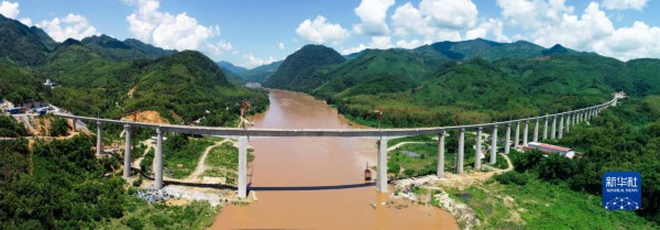 这是2020年7月24日在老挝拍摄的中老铁路班纳汉湄公河特大桥(无人机照片)。新华社发(潘龙柱 摄)