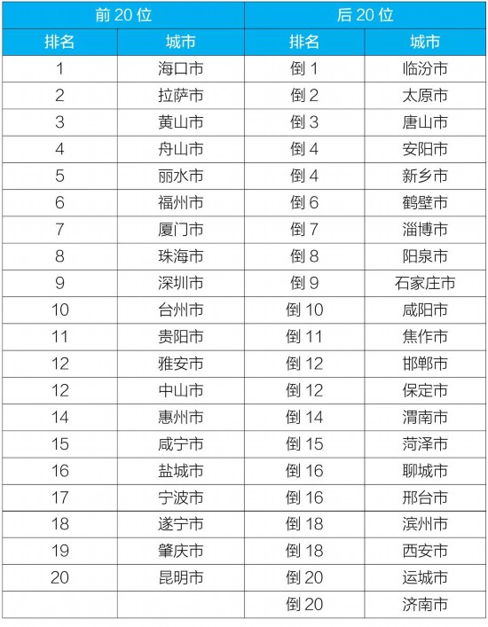 10月168个重点城市空气质量排名前20位和后20位城市名单