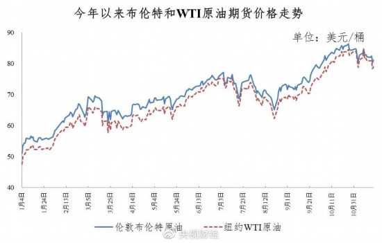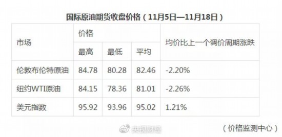 据国家发改委价格监测中心监测,本轮成品油调价周期内(11月5日—11月18日)国际油价震荡下降。平均来看,伦敦布伦特、纽约WTI油价比上轮调价周期下降2.23%。