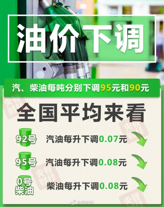 央视财经记者从国家发改委获悉,本次油价调整具体情况如下:汽油每吨下调95元,柴油每吨下调90元。