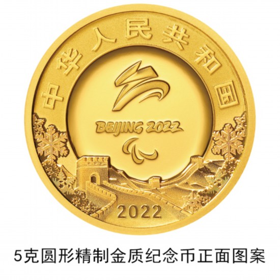 5克圆形金质纪念币背面图案为冬残奥会吉祥物,辅以雪花元素组合设计,并刊“北京2022年冬残奥会”字样及面额。