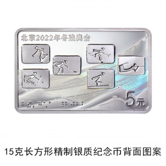15克长方形银质纪念币背面图案为冬残奥会6个运动项目体育图标,辅以核心图形、雪花、“北京2022”盲文等元素组合设计,并刊“北京2022年冬残奥会”字样及面额。