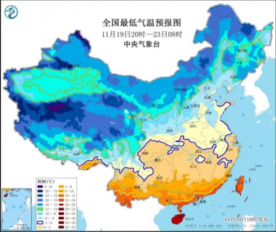 中央气象台今天(11月19日)18时发布寒潮蓝色预警,预计受较强冷空气影响,今天20时至23日08时,我国自西北向东南将有一次大风降温天气过程,大部地区气温将先后下降6~10℃,内蒙古西部、山西西部、黄淮东部、江淮中东部、江南北部和西南部等地的部分地区降温幅度可达12℃,局地14℃以上;并伴有4~6级偏北风、阵风7~9级;23日早晨最低气温0℃线将位于长江中下游至四川盆地北部一带,江南南部最低气温将降至4℃左右。