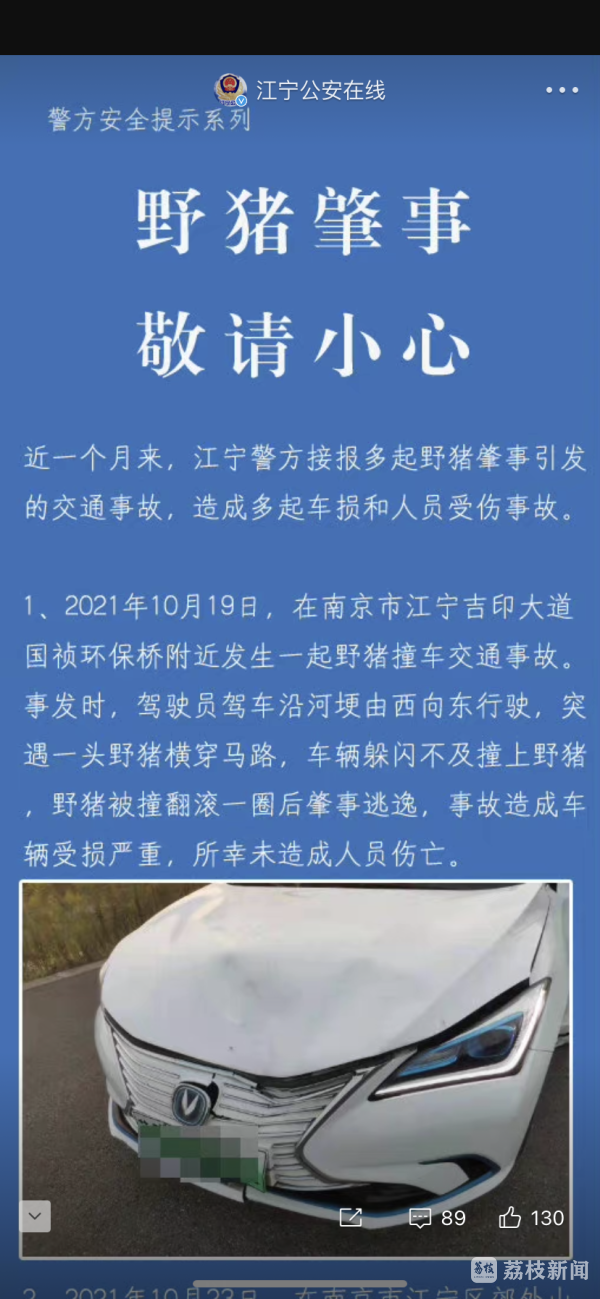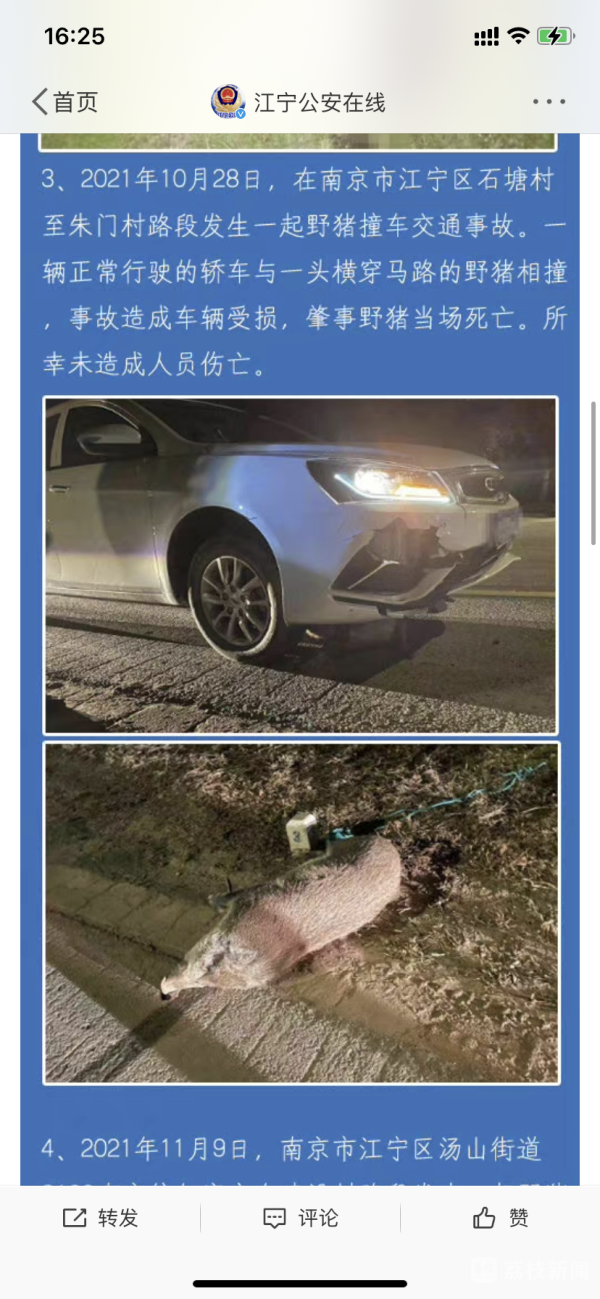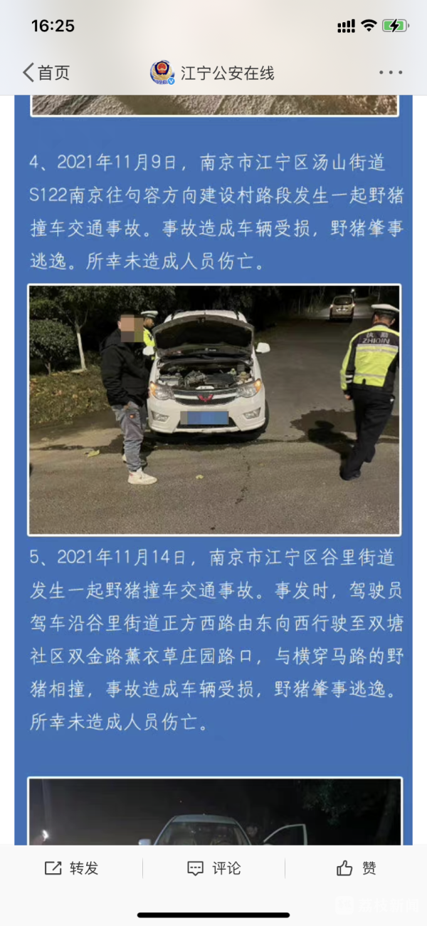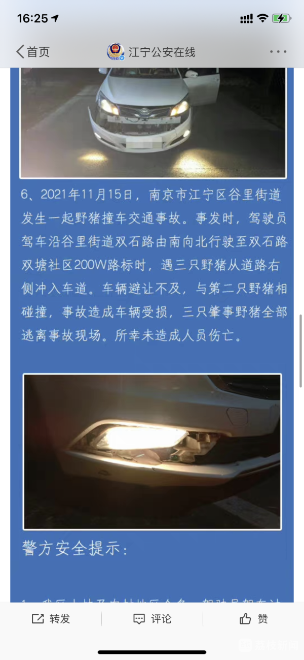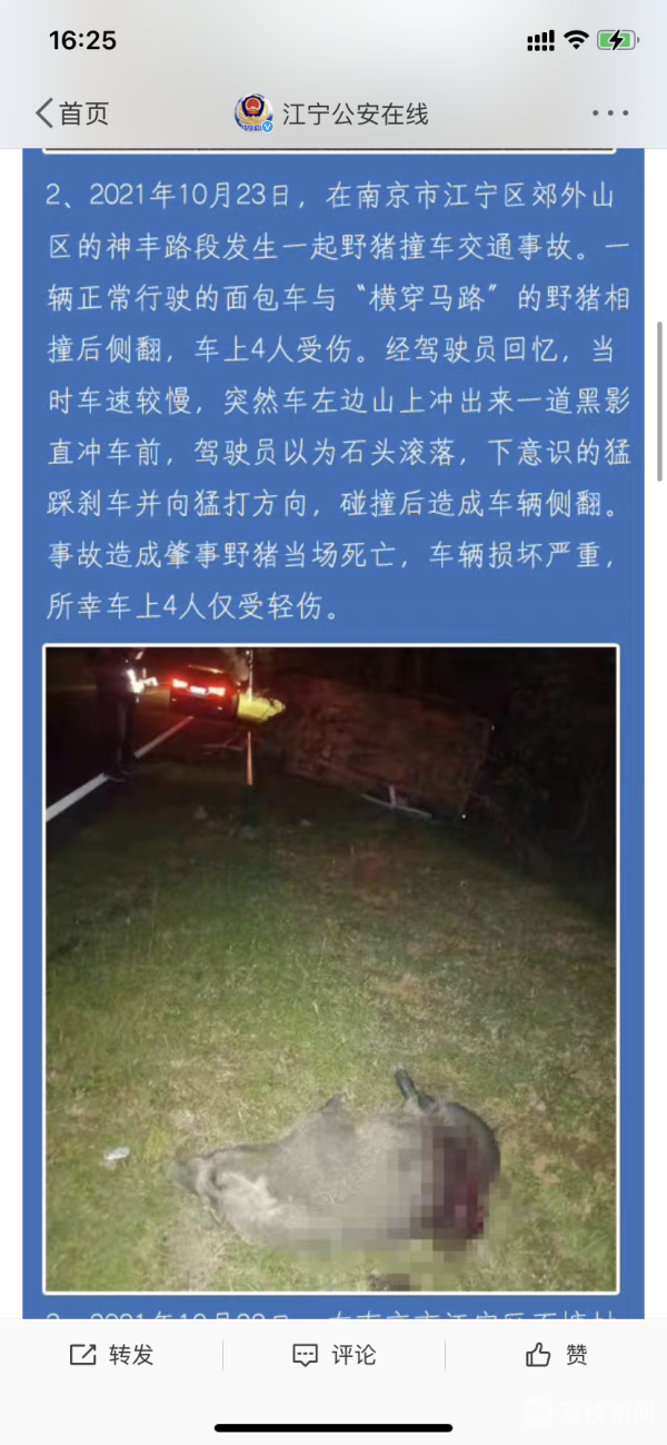 我苏网讯 最近一个月来,南京江宁警方接报多起野猪撞车导致的交通事故。今天(11月19日)下午,警方通报了其中几起警情,并且做出相关警示及安全防范提醒。