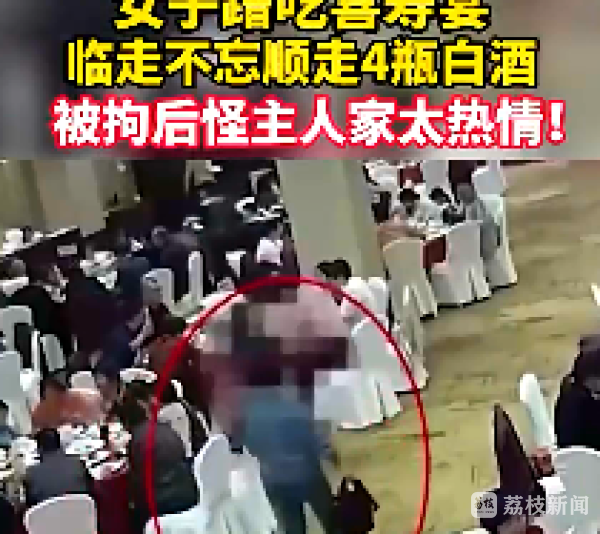 11月6日晚,浙江绍兴警方接到报警称:一名中年女子利用主人办喜事不细查来宾的心理,在婚宴蹭吃蹭喝,临走还顺走了4瓶喜酒。目前嫌疑人已经被警方抓获。这则消息在昨天冲到了热搜第一,不少网友都留言称,自己办酒席的时候也遇到过类似的情况。今年国庆期间,南京的席女士在婚宴结束后清点白酒的时候,发现少了8瓶没有开封的白酒。