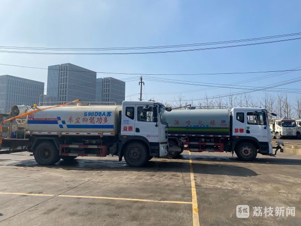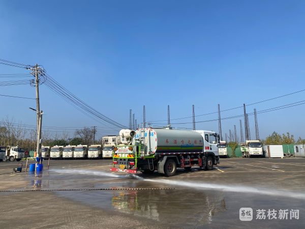 11月19日上午,记者在栖霞区尧化街道一处渣土车停车场看到,停车场门口悬挂了指示牌,场内停放了40多辆渣土车,整洁有序。空地上,多功能抑尘车正在水泥路面洒水降尘。