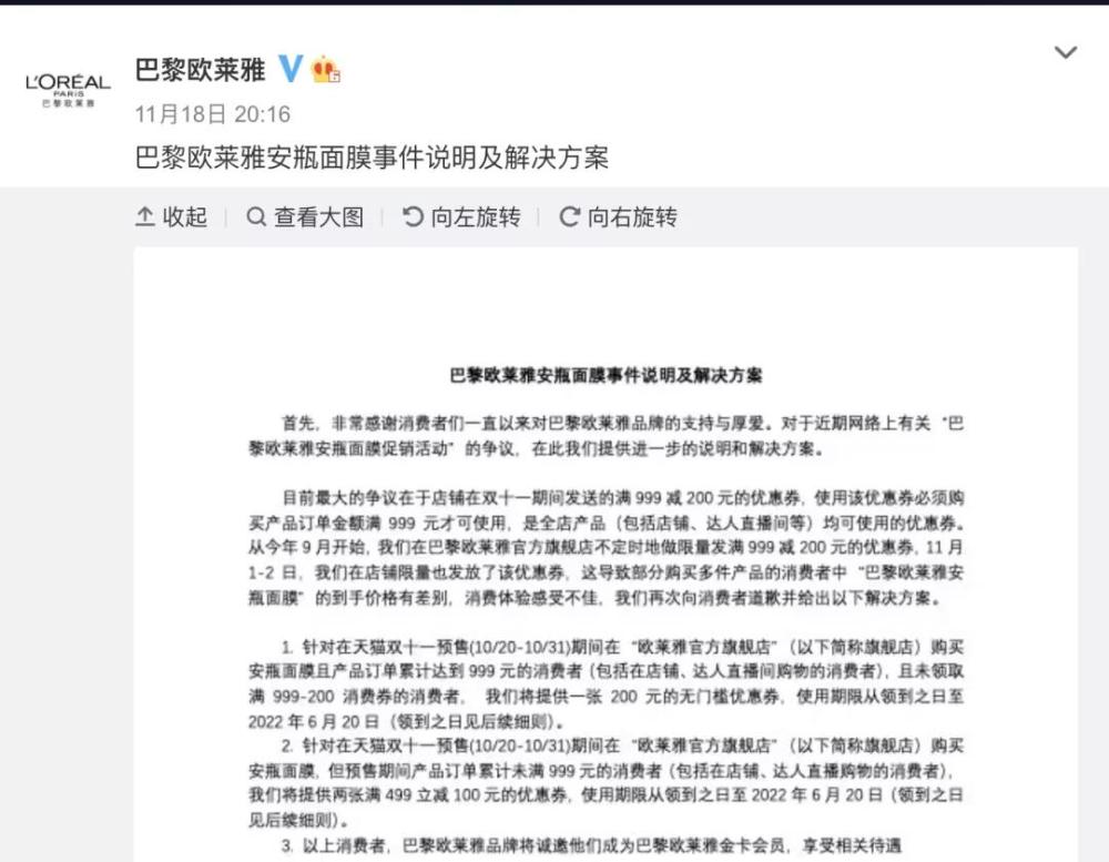 11月18日晚,巴黎欧莱雅再回应安瓶面膜事件:针对部分购买多件产品的消费者中“巴黎欧莱雅安瓶面膜”的到手价格有差别,消费体验感受不佳,再次向消费者道歉并给出解决方案。