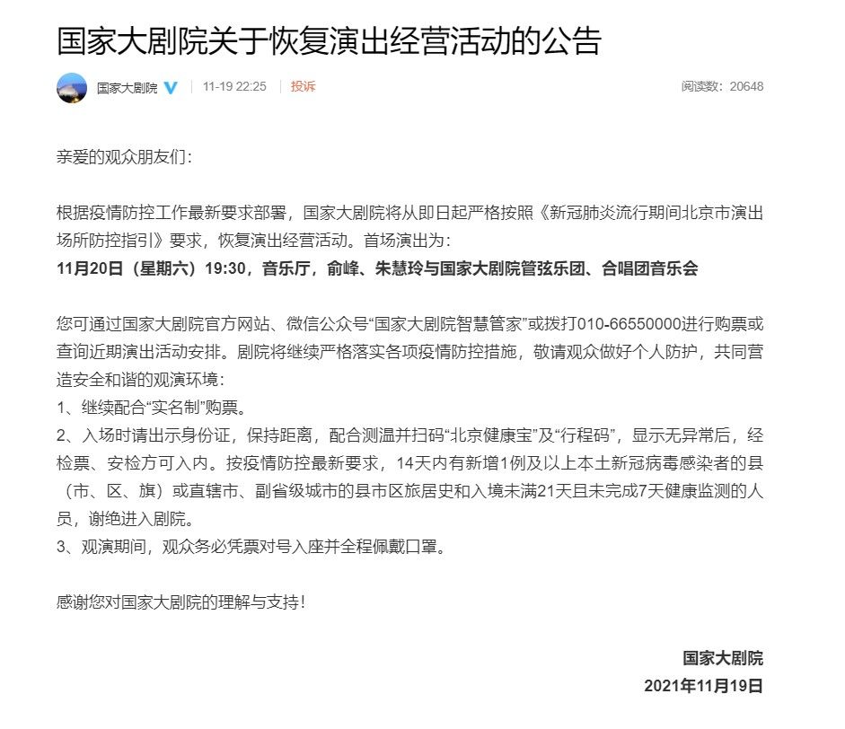 荔枝新闻讯 国家大剧院11月19日晚发布关于恢复演出经营活动的公告。