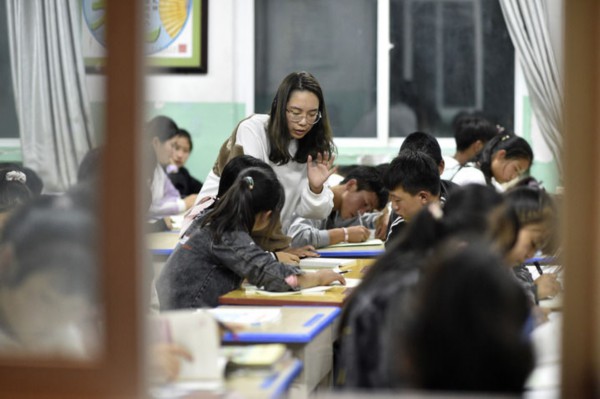 复旦大学第23届研究生支教团支教老师徐菁在晚自习上为宁夏西吉县王民乡王民中学学生解答问题(9月1日摄)。新华社记者 王鹏摄