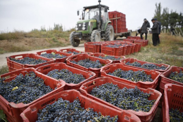 工人在宁夏西鸽酒庄葡萄园搬运采摘下的酿酒葡萄(10月14日摄)。新华社记者 王鹏 摄