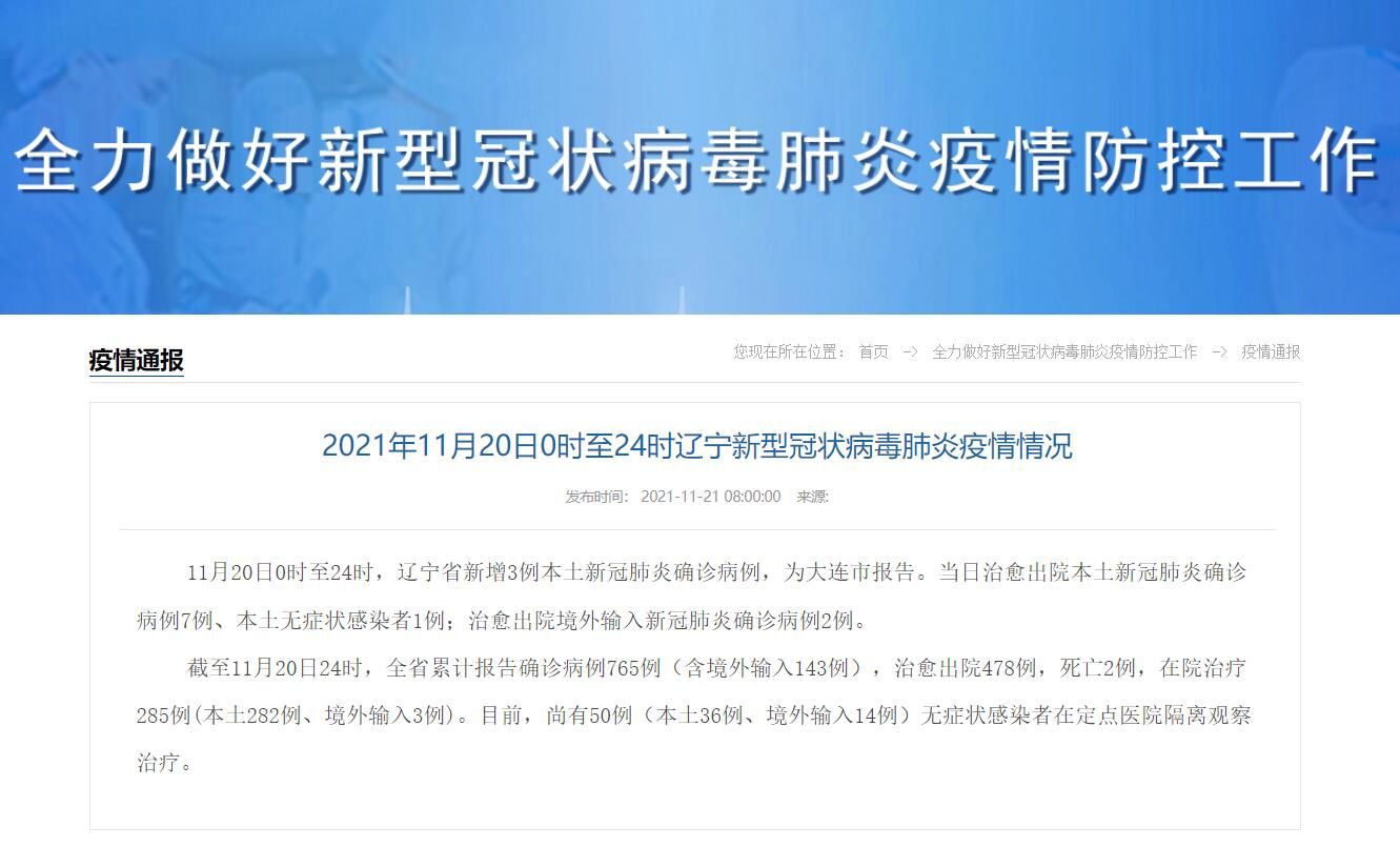 截至11月20日24时,辽宁省累计报告确诊病例765例(含境外输入143例),治愈出院478例,死亡2例,在院治疗285例(本土282例、境外输入3例)。目前,尚有50例(本土36例、境外输入14例)无症状感染者在定点医院隔离观察治疗。