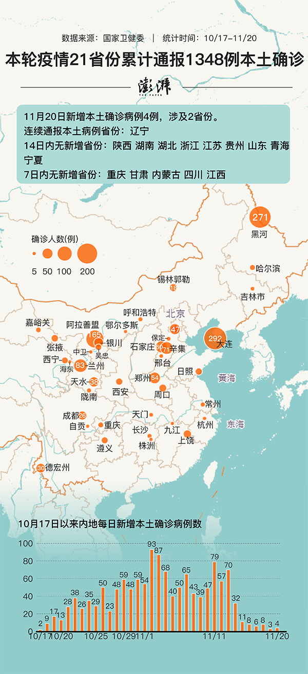 据国家卫健委通报,11月20日0-24时,内地新增本土确诊4例,涉及2个省份,具体为辽宁省3例,均在大连,云南省1例,在德宏州。至此,10月17日至11月20日,本轮疫情已累计本土确诊病例为1348例,波及21个省份。