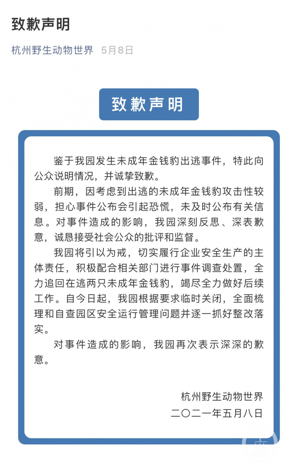 5月8日下午,出逃的第二只金钱豹被捕获,同日,杭州野生动物世界因发生重大安全事故被闭园整改。对于隐瞒金钱豹“出逃”一事,杭州野生动物世界曾在闭园当天发布《致歉声明》称,“前期,因考虑到出逃的未成年金钱豹攻击性较弱,担心事件公布会引起恐慌,未及时公布有关信息。我园将积极配合相关部门进行事件调查处置,全力追回在逃两只未成年金钱豹,竭尽全力做好后续工作。自今日起,我园根据要求临时关闭,全面梳理和自查园区安全运行管理问题并逐一抓好整改落实。”