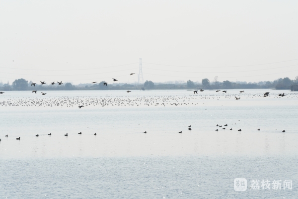 万鸟齐飞,这几天,大纵湖国家湿地公园,迎来了上万只水鸟前来栖息。在宽阔的大纵湖水面上,水鸟有的静卧水面,有的盘旋飞翔,与宁静的水面构成一幅生机勃勃、旖旎灵动的湿地画卷。优美动人的自然景观,吸引了不少摄影爱好者前来打卡拍照。