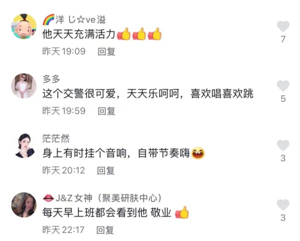 “每次上班看到他心情都会变好”,视频下方不少网友前来留言,大家纷纷表示自己也曾见过这位辅警。有网友表示,这位辅警每天都会出现在扬州宝应县安宜高中附近的路口。“来得最早,走得最迟”是大家对他最直观的印象,虽然指挥交通的工作比较繁琐,但这名辅警却显得乐在其中,让人不由得觉得“亲近”。