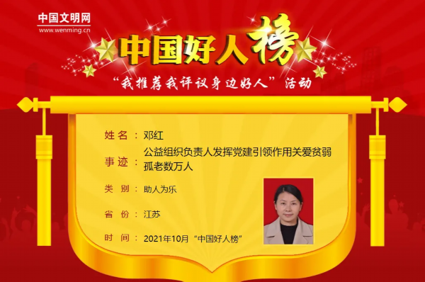 近日,中央文明网发布2021年10月“中国好人榜”,淮安洪泽区“水上百合”志愿者协会党支部书记邓红成功入选。