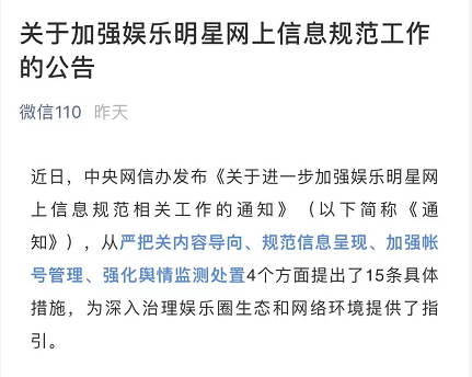 荔枝新闻 据“微信110”消息,近日,中央网信办发布《关于进一步加强娱乐明星网上信息规范相关工作的通知》(以下简称《通知》),从严把关内容导向、规范信息呈现、加强帐号管理、强化舆情监测处置4个方面提出了15条具体措施,为深入治理娱乐圈生态和网络环境提供了指引。
