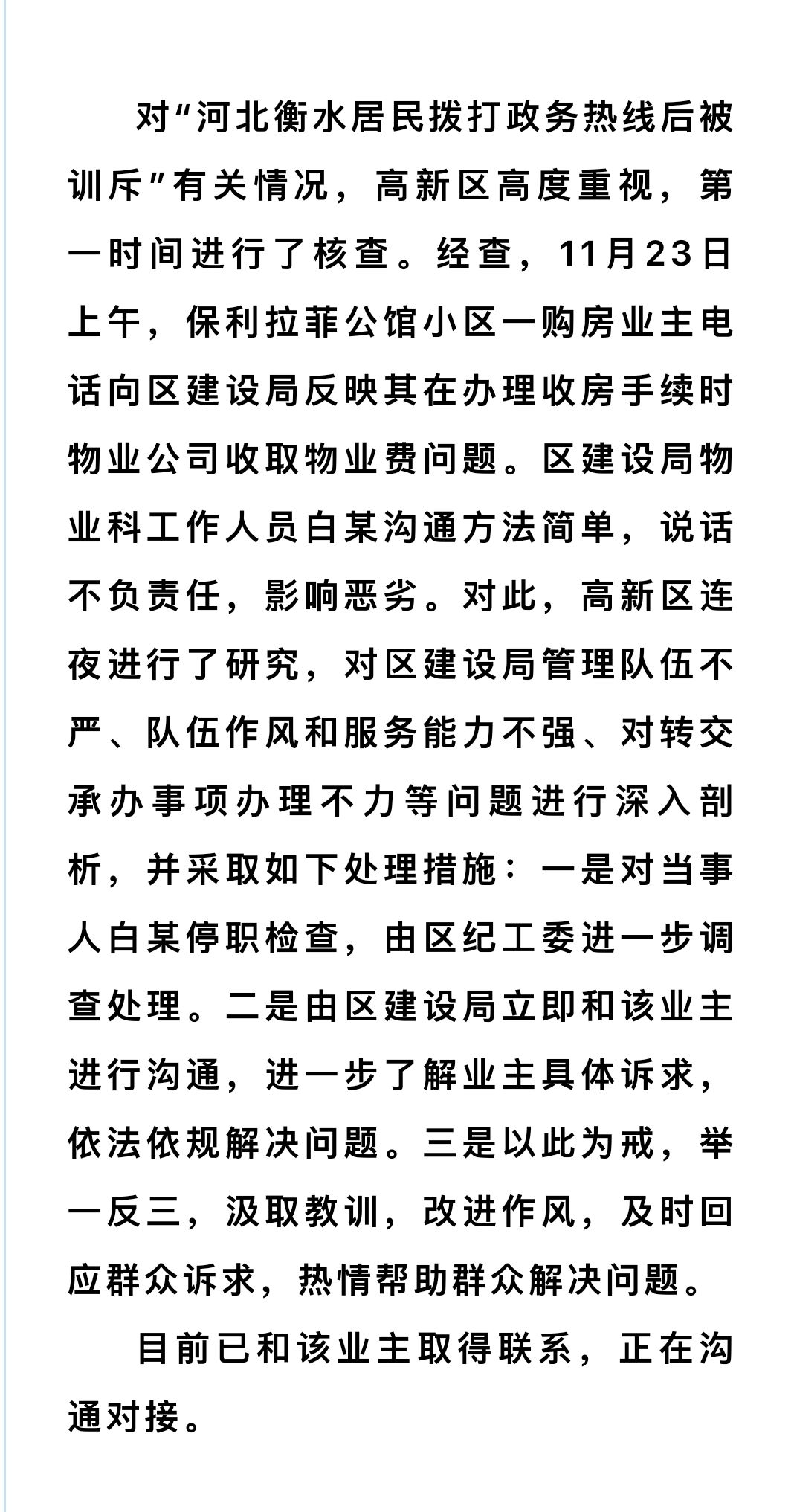 荔枝新闻讯 据“衡水高新区”微信公众号消息,对“河北衡水居民拨打政务热线后被训斥”有关情况,高新区高度重视,第一时间进行了核查。经查,11月23日上午,保利拉菲公馆小区一购房业主电话向区建设局反映其在办理收房手续时物业公司收取物业费问题。区建设局物业科工作人员白某沟通方法简单,说话不负责任,影响恶劣。对此,高新区连夜进行了研究,对区建设局管理队伍不严、队伍作风和服务能力不强、对转交承办事项办理不力等问题进行深入剖析,并采取如下处理措施:一是对当事人白某停职检查,由区纪工委进一步调查处理。二是由区建设局立即和该业主进行沟通,进一步了解业主具体诉求,依法依规解决问题。三是以此为戒,举一反三,汲取教训,改进作风,及时回应群众诉求,热情帮助群众解决问题。