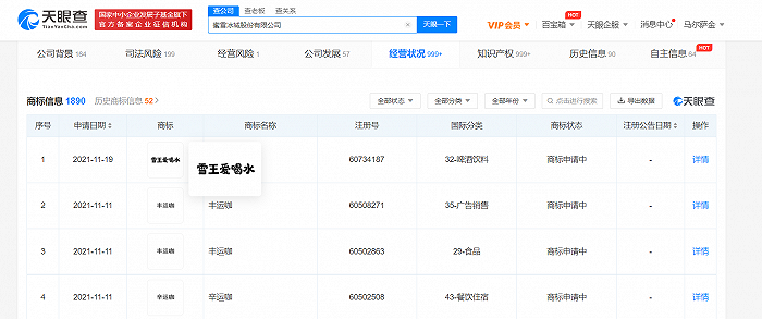 荔枝新闻讯 据天眼查APP显示,11月19日,蜜雪冰城股份有限公司申请注册“雪王爱喝水”商标,国际分类为啤酒饮料,目前商标状态为申请中。不久前,该公司“雪王爱喝水”瓶子外观设计专利获得授权。专利摘要图显示,瓶体有“饮用纯净水”字样。