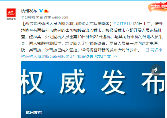 荔枝新闻讯 杭州发布消息,11月25日上午,接外地协查有两名外市病例的密切接触者流入我市,接报后我市立即开展人员追踪排查。经核实,外地回杭人员翟某19日外出22日返杭,与其同行来杭的外地人员朱某,两人核酸检测阳性,均诊断为无症状感染者。两名人员第一时间送定点医院,其密接、次密接已纳入管控。详情将召开新闻发布会对外公布。