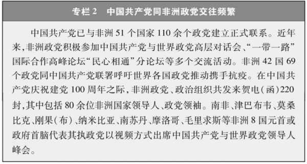 中国和非洲国家密切开展政党、立法和协商机构交往,构建多层次、多渠道、多形式、全方位的友好合作。中国共产党在独立自主、完全平等、相互尊重、互不干涉内部事务的原则基础上,不断密切同非洲国家政党交流与合作,构建求同存异、相互尊重、互学互鉴的新型政党关系。双方从立法和监督方面发挥积极影响,为中非合作和交往提供政策支持和保障。全国人大与埃及、南非、肯尼亚议会建立定期交流机制,与35个非洲国家议会建有双边友好小组。全国政协及所属机构已同39个非洲国家的59个机构开展交往。2019年6月,全国政协成立中非友好小组,是全国政协历史上第一个对外友好小组。