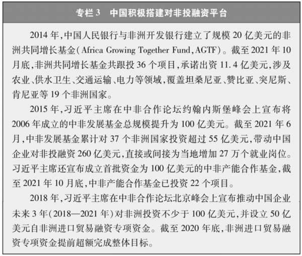 ——加强金融合作。中非金融机构积极开发对方市场,双方央行积极扩大本币结算和互换安排,推动中非金融便利化水平稳步提高。截至2021年10月,人民币跨境支付系统(CIPS)有42家非洲地区间接参与者,覆盖19个非洲国家。中国央行先后与南非、摩洛哥、埃及和尼日利亚央行签署了本币互换协议,金额总计730亿元人民币。中国已同埃及、南非、尼日利亚等7个非洲国家签署了金融监管合作谅解备忘录,为双方金融合作行稳致远打牢基础。中国加入非洲开发银行、东南非贸易与开发银行和西非开发银行等多边开发金融机构。中国已累计向非洲开发银行下的非洲开发基金承诺捐资9.96亿美元。