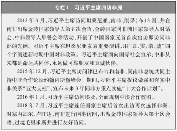 中国是世界上最大的发展中国家,非洲是发展中国家最集中的大陆。相似的历史遭遇、共同的历史使命把中国和非洲紧紧联系在一起,中非从来就是命运共同体。发展同非洲国家的团结合作是中国对外政策的重要基石,也是中国长期坚定的战略选择。中国和非洲国家在争取民族解放和国家独立的斗争中相互支持,持续深化政治互信;在实现经济发展和民族振兴的道路上互帮互助,不断拓展合作新领域;在重大国际和地区问题上密切协调,共同捍卫国际公平正义。