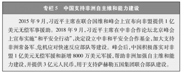 中非不断深化和平安全领域的交流与对话,2019年以来,中国先后举行中非实施和平安全行动对话会、首届中非和平安全论坛、中非和平安全论坛军事医学专题视频会议,并积极参与非洲国家举行的和平安全领域重要会议或论坛。中国政府非洲事务特别代表积极斡旋非洲热点问题,为推进非洲和平与安全发挥了独特建设性作用。中国通过联演联训、舰艇互访等多种方式,支持非洲国家加强国防和军队建设,支持萨赫勒、亚丁湾、几内亚湾等地区国家维护地区安全和反恐努力,在共建“一带一路”、社会治安、联合国维和、打击海盗、反恐等领域推动实施安全援助项目并帮助非洲国家培训军事人员。中国支持联合国在维护非洲和平与稳定方面发挥重要作用,是安理会常任理事国中向非洲派遣维和人员数量最多的国家。