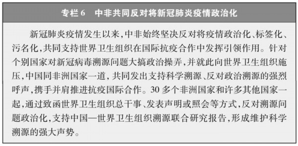 面对突如其来的新冠肺炎疫情,中非双方经受住严峻考验,相互声援、并肩战斗,共同唱响团结合作、共克时艰的时代强音。
