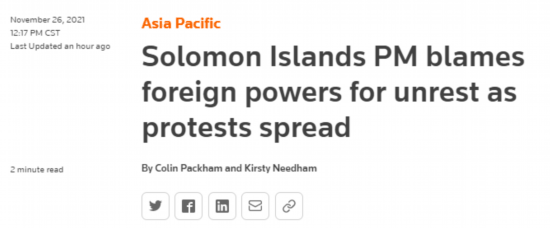 关于此次所罗门群岛骚乱,英国《卫报》25日进行了报道。该媒体提到,其抗议者主要来自所罗门群岛的马莱塔省。该省长期以来抱怨被中央政府忽视,反对所罗门群岛2019年与中国建交的决定,该省省长要求总理索加瓦雷辞职。