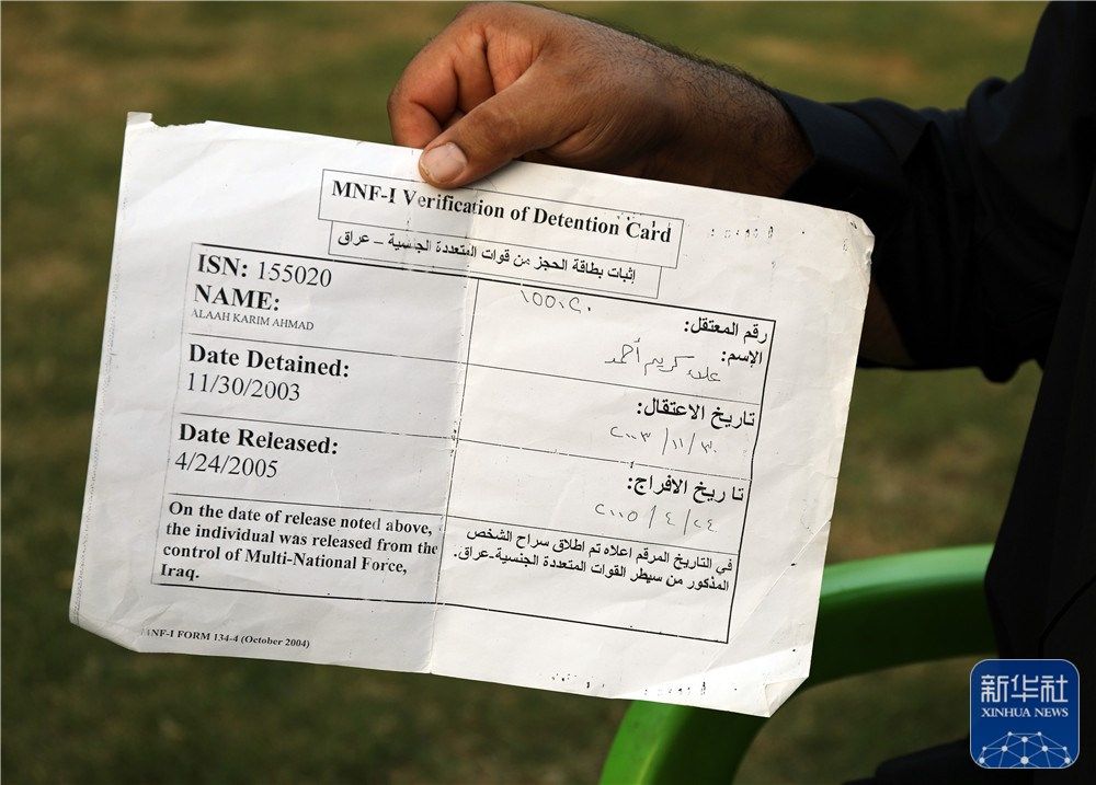 随后,我被转移到伊拉克最大的监狱布卡营。在这里,更多的伊拉克人被关押。前后被关押两年半时间后,我拿到一纸证明被无罪释放,至今我还保留着这张证明。