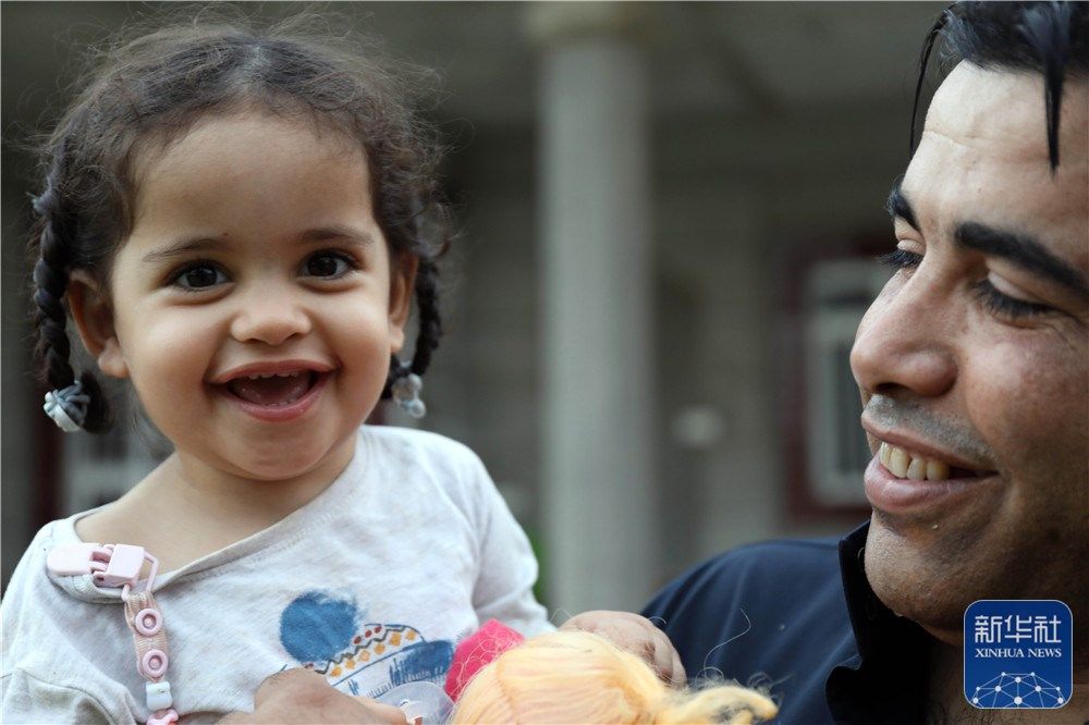 在伊拉克萨拉赫丁省杜鲁亚镇,阿拉·卡里姆·艾哈迈德和女儿玩耍(11月2日摄)。新华社发