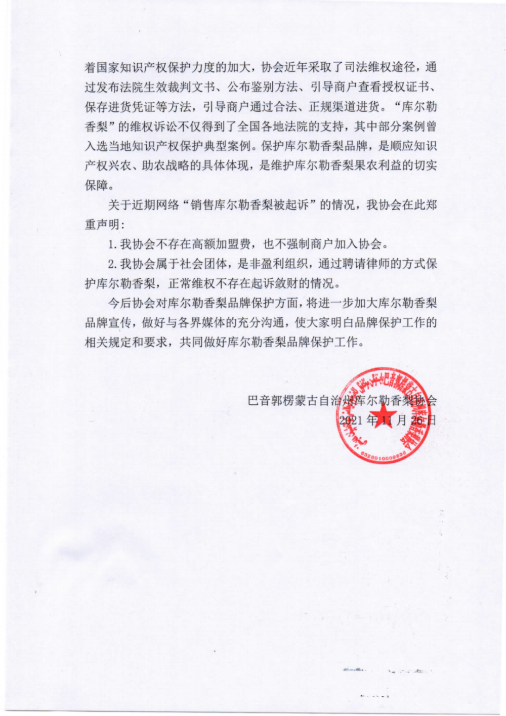 荔枝新闻讯 11月26日,就媒体报道的“多家水果商户称卖香梨使用‘库尔勒香梨’商标被起诉“一事,新疆巴州库尔勒香梨协会微信公众号发布一份声明(如下图)称:该协会不存在高额加盟费,也不强制商户加入协会;该协会属于社会团体,是非营利组织,正常维权不存在起诉敛财的情况。