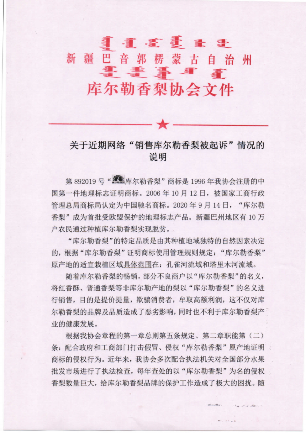 关于近期网络“销售库尔勒香梨被起诉”情况的说明:
