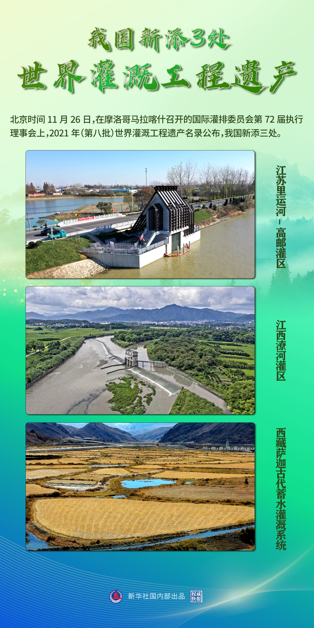 记者从水利部获悉,北京时间11月26日,在摩洛哥马拉喀什召开的国际灌排委员会第72届执行理事会上,2021年(第八批)世界灌溉工程遗产名录公布:江苏里运河-高邮灌区、江西潦河灌区、西藏萨迦古代蓄水灌溉系统成功入选。