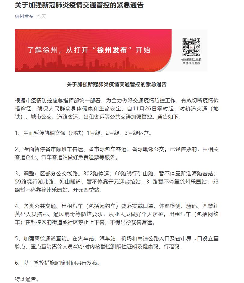 我苏网讯 据“徐州发布”官方微信公号消息,根据徐州市疫情防控应急指挥部统一部署,为全力做好交通疫情防控工作,有效切断疫情传播途径,确保人民群众身体健康和生命安全,自11月26日零时起,对轨道交通(地铁)、城市公交、道路客运、出租客运等公共交通加强管控。通告如下: