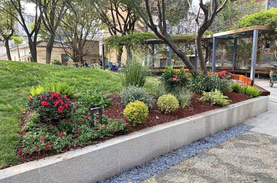 以红梅为种植特色,增加中式特色地被,创造多季观花且舒适的自然空间。