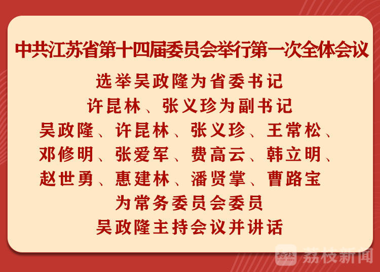 会议通过了《中共江苏省第十四届委员会第一次全体会议选举办法》和监票人名单。接着,以无记名投票的方式,差额选举产生了12名中国共产党江苏省第十四届委员会常务委员会委员。他们是:吴政隆、许昆林、张义珍、王常松、邓修明、张爱军、费高云、韩立明、赵世勇、惠建林、潘贤掌、曹路宝。