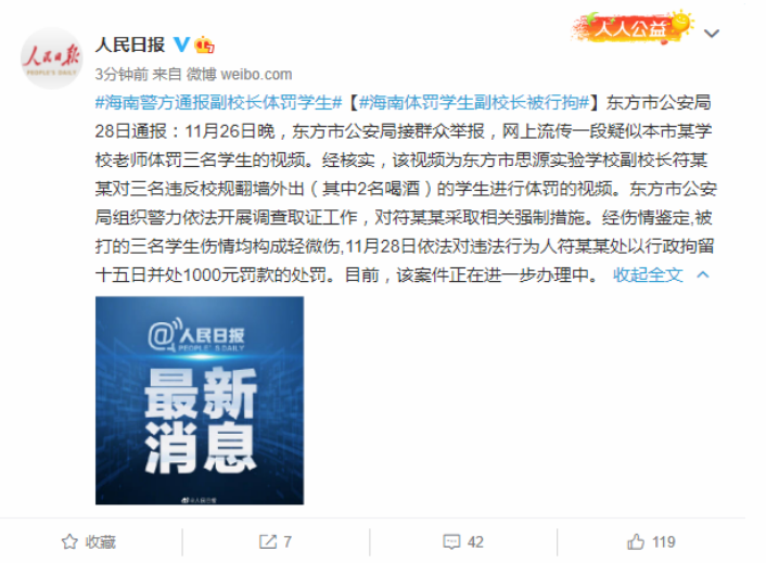 据人民日报消息,东方市公安局28日通报:11月26日晚,东方市公安局接群众举报,网上流传一段疑似本市某学校老师体罚三名学生的视频。经核实,该视频为东方市思源实验学校副校长符某某对三名违反校规翻墙外出(其中2名喝酒)的学生进行体罚的视频。东方市公安局组织警力依法开展调查取证工作,对符某某采取相关强制措施。经伤情鉴定,被打的三名学生伤情均构成轻微伤,11月28日依法对违法行为人符某某处以行政拘留十五日并处1000元罚款的处罚。目前,该案件正在进一步办理中。